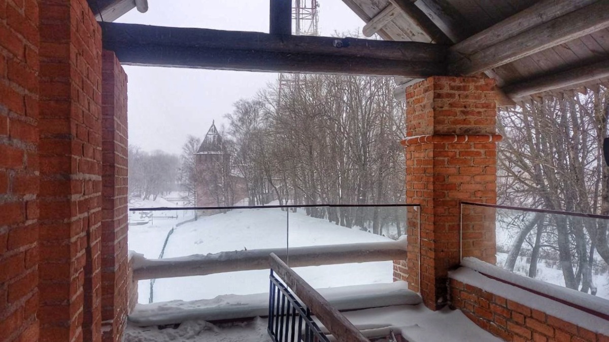 В шатре, на самом верху еще холоднее. Снег тонким слоем покрыл весь пол. Между бойницами — новые стенды. На них — информация о различных кремлях и крепостях не только России, но и Белоруссии.