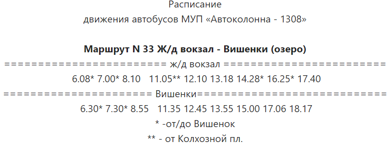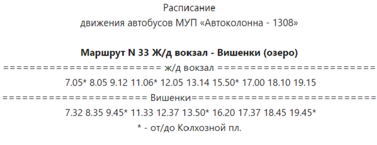 «Автоколонна-1308» сообщила, что маршрут №33 «ДРЦ «Вишенки» – Железнодорожный вокзал» продлевается до Реадовского озера. На сайте предприятия опубликовано актуальное расписание по рабочим и выходным дням.