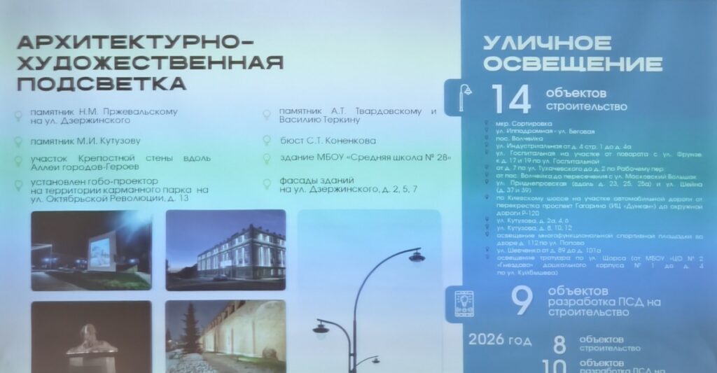 Благоустройство меняет облик Смоленска. В 2025 году приведены в порядок несколько крупных общественных территорий. Город активно избавляется от незаконных рекламных конструкций и ларьков. Так, за год демонтировано около 430 баннеров, согласовано 320 паспортов фасадов в соответствии с дизайн-кодом. За два года убрано 550 нестационарных объектов. В 2026 году запущена программа по восстановлению уличного освещения во всех дворах многоквартирных домов.