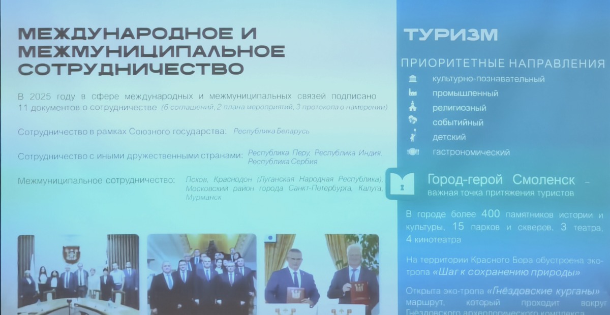 «Достигнутые результаты стали итогом слаженной и ответственной работы администрации города, депутатов Смоленского городского Совета, общественных организаций, бизнеса и непосредственно жителей нашего города. Огромная благодарность губернатору Смоленской области В.Н. Анохину и правительству региона за оказанное содействие в решении ключевых вопросов городского хозяйства. В этом году нам предстоит важная работа в престижном статусе «Молодёжная столица России 2026». Это звание накладывает на нас серьёзные обязательства по созданию новых возможностей для молодежи, развитию городской среды и реализации ярких проектов», — резюмировал Александр Новиков.