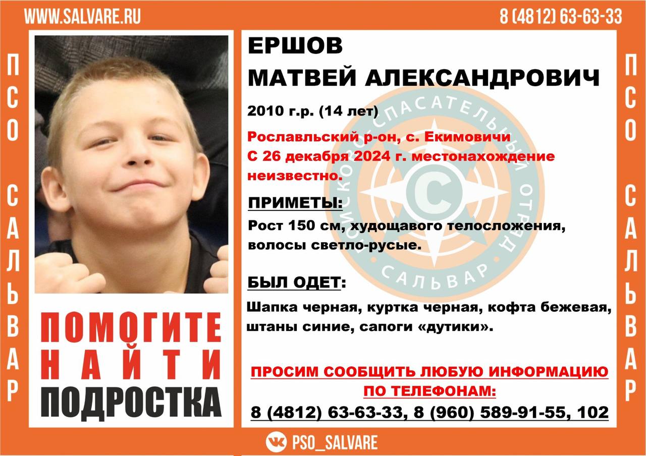 В селе Екимовичи Рославльского района Смоленской области пропал 14-летний Матвей Ершов. Местонахождение подростка остается неизвестным уже десятый день, с 26 декабря. По собственной информации нашего издания, ребенок рос не в благополучной многодетной семье.