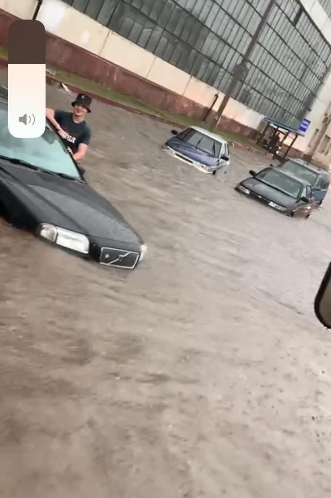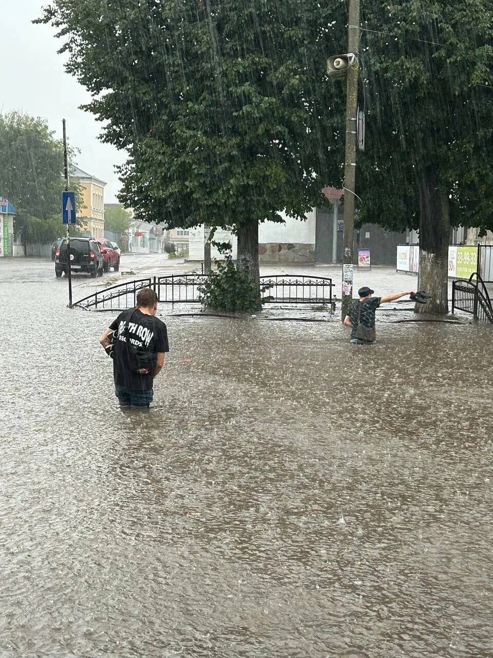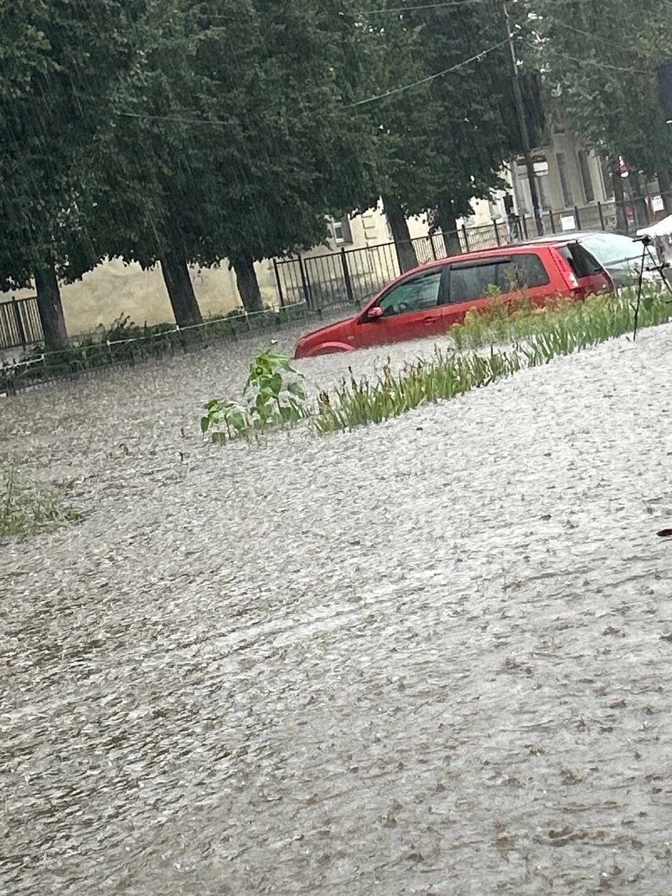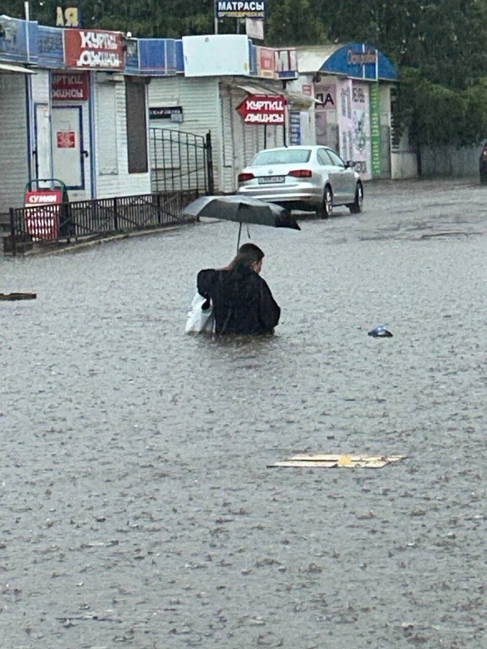 В районе Колхозной площади улицы сильно затопило: люди находятся по пояс в воде, машины «плавают».