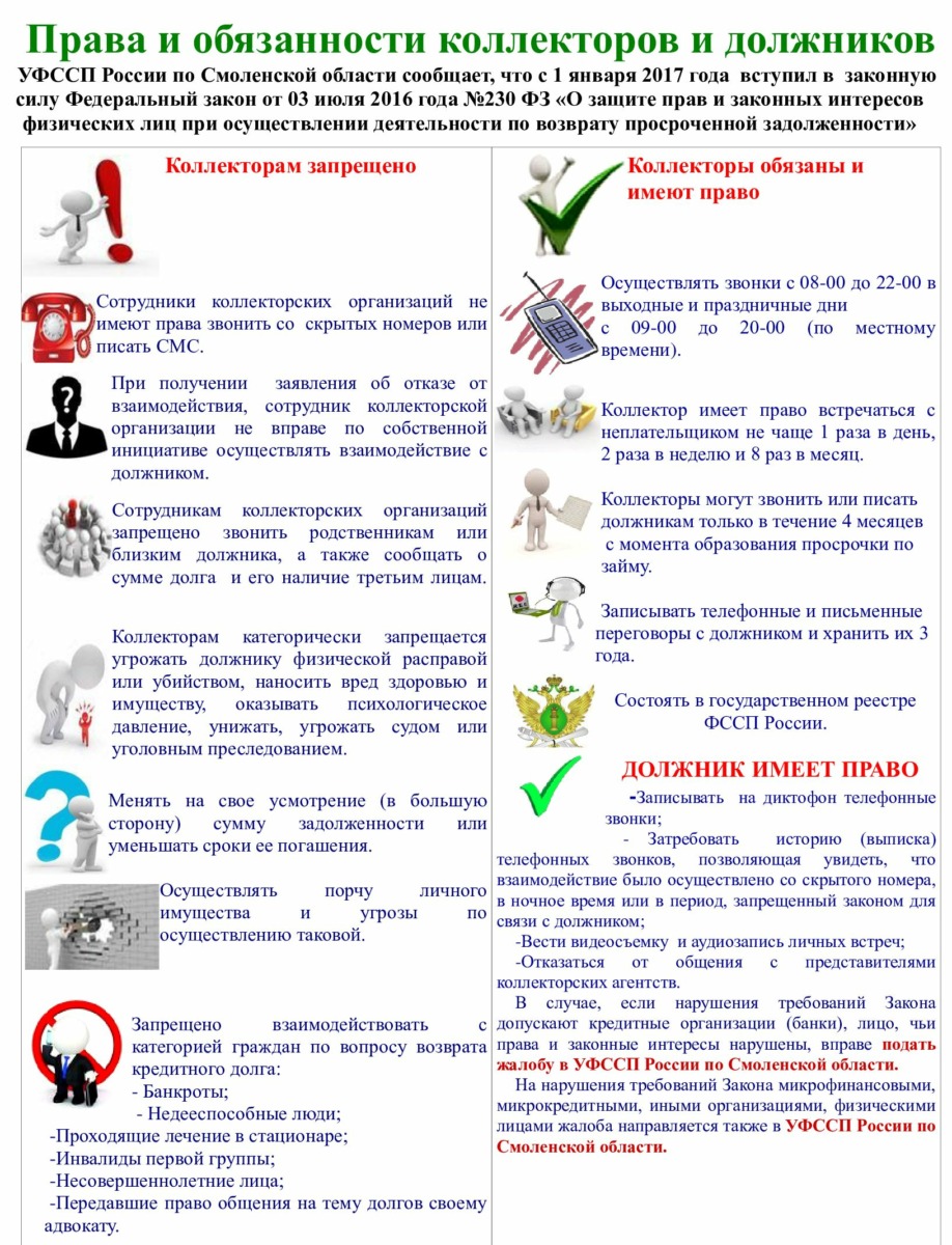По ее словам, на Федеральную службу судебных приставов возложены функции по контролю и надзору за деятельностью коллекторских агентств и микрофинансовых организаций. Стоит помнить, что коллекторы ограничены в своих правах.