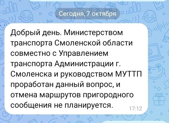 Министерство транспорта Смоленской области опровергло сообщения о возможной отмене рейсов на пригородных маршрутах.