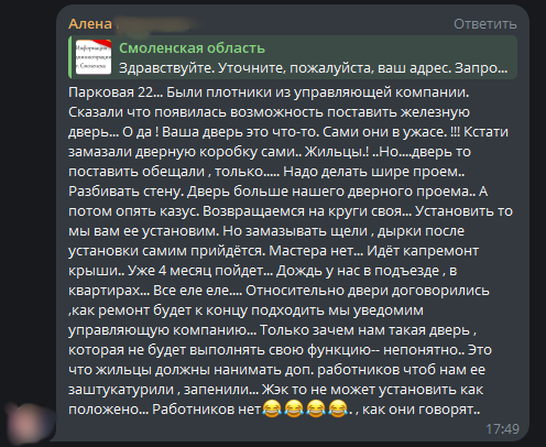 “Естественно, дверь косая, не закрывается. Своей функции не выполняет. Но и на том спасибо! Хоть в подъезд ветер меньше дует, и дождь не льет струей. А вы тут рассказываете об утепленной, обшитой, стальной…” – пишет смолянка.