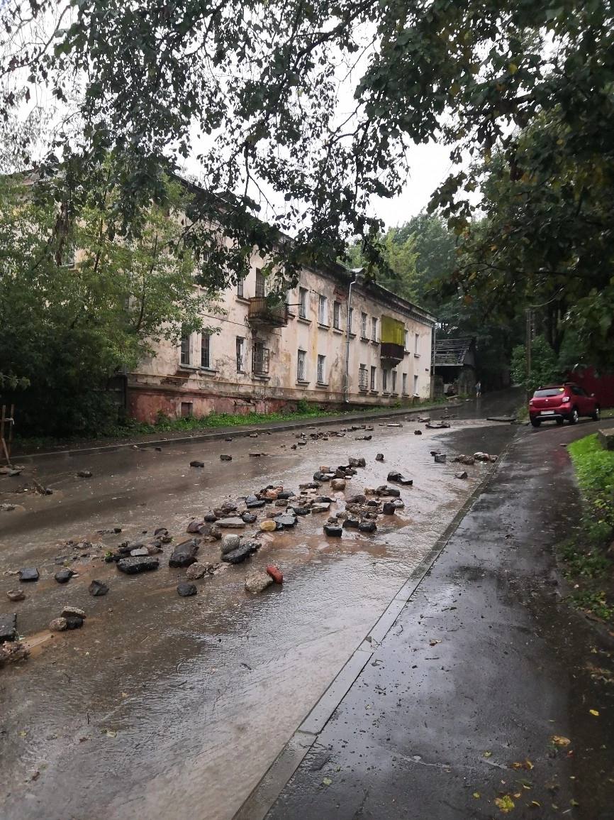 Тем временем на дорогу по улице Войкова вымыло булыжники старой мостовой.