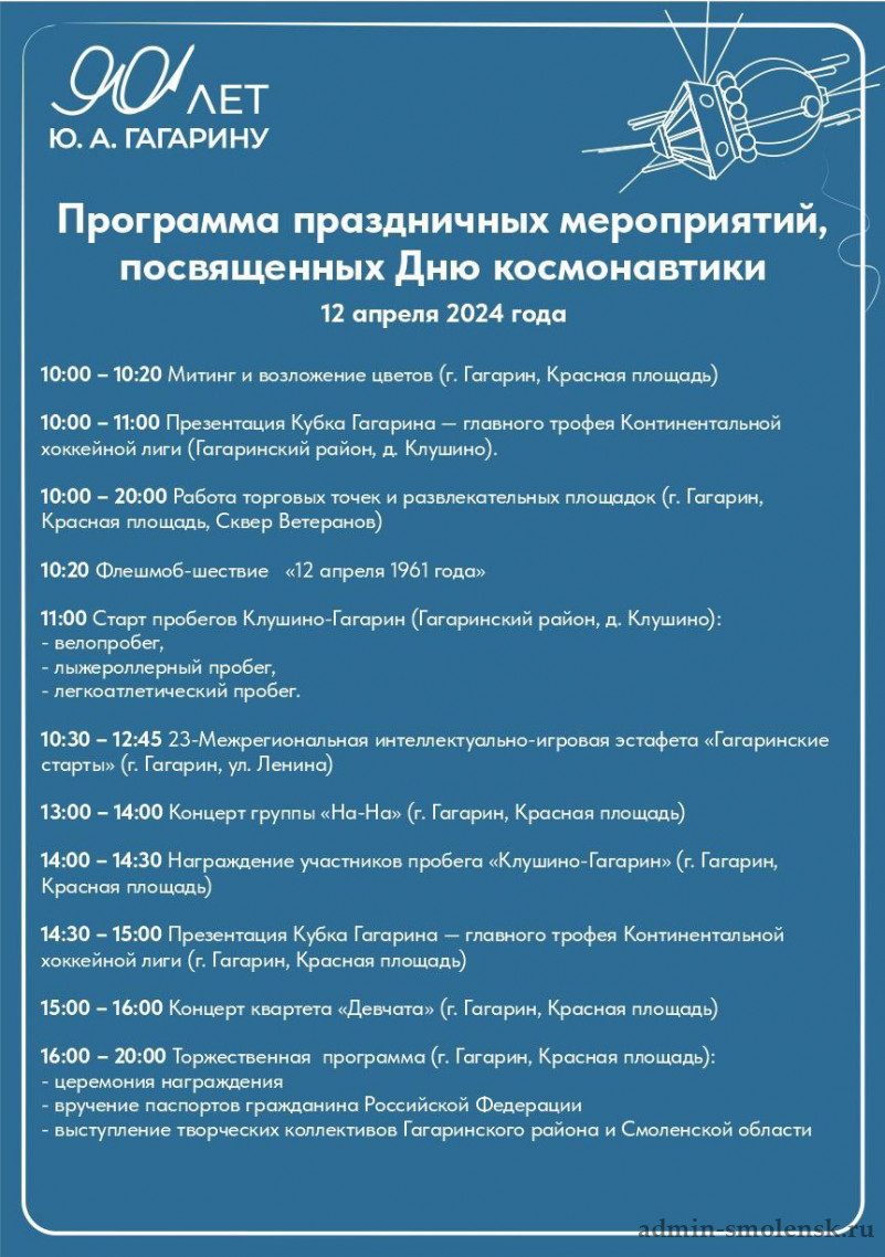 В министерстве культуры и туризма Смоленской области опубликовали программу мероприятий, которые пройдут 12 апреля в Гагарине.