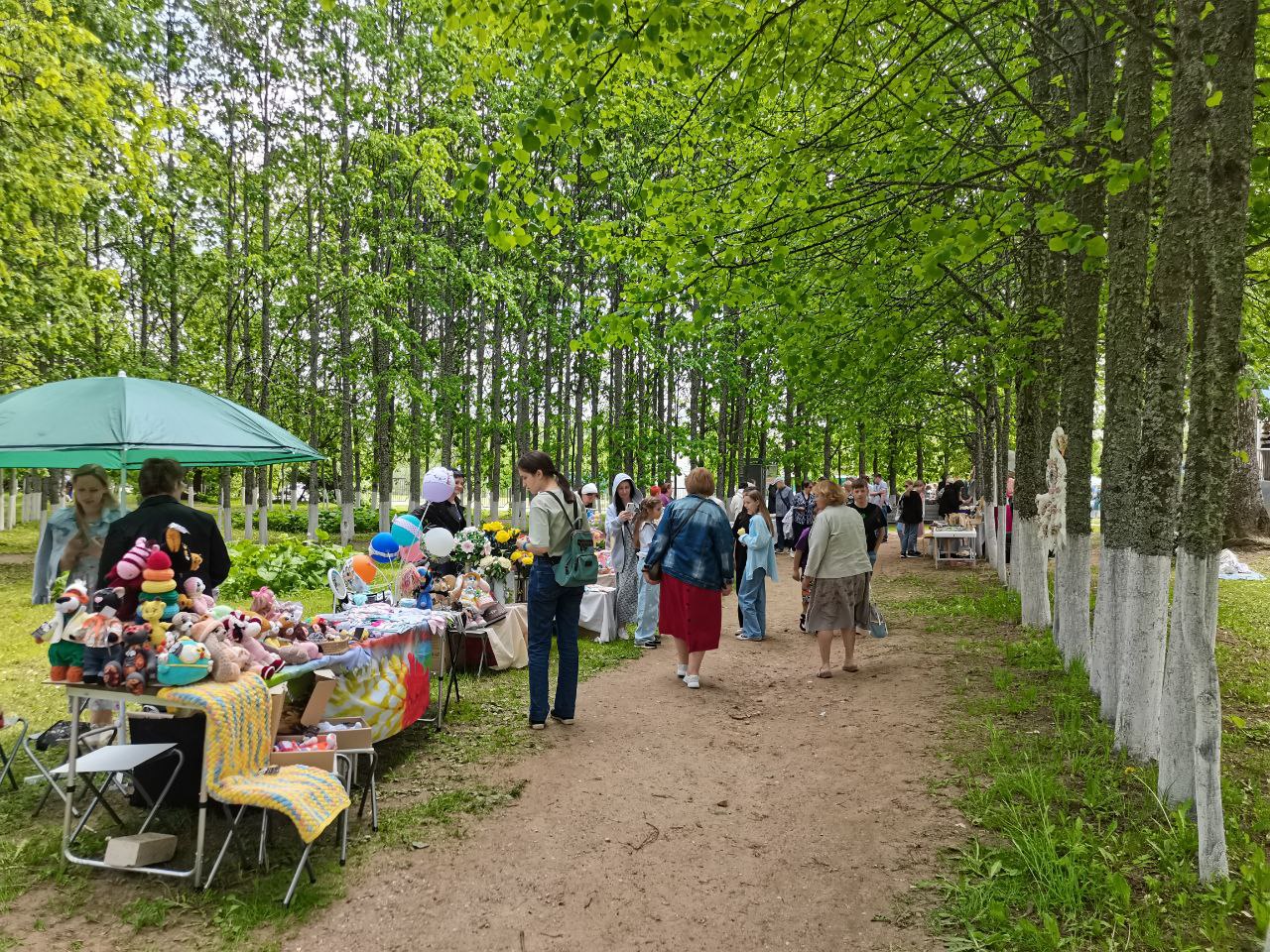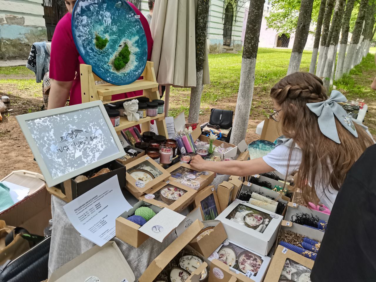 С утра в парке начала работать ярмарка народных ремесел. Здесь можно было приобрести изделия из кожи и бересты, мыло и свечи ручной работы, мед и сладости. Сказать, что эта выставка-продажа пользовалась у гостей Грибоедовского дня большим спросом, было бы преувеличением. Но за неимением других интересных активностей люди слонялись среди нескольких прилавков, рассматривая расписные подносы и шкатулки. Обещанных на том же портале культура.рф мастер-классов, где бы «умельцы раскрывали секреты своего мастерства», замечено не было, хотя мы обошли всю территорию парка несколько раз.