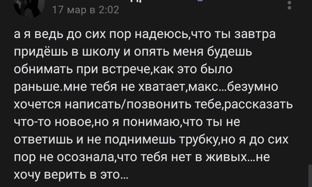 И вспоминает, что 7 марта был праздничный концерт для учителей. Максим с ребятами выступал от класса… А на следующий день – трагедия потрясла 8А. Всех – и учителей, и одноклассников.