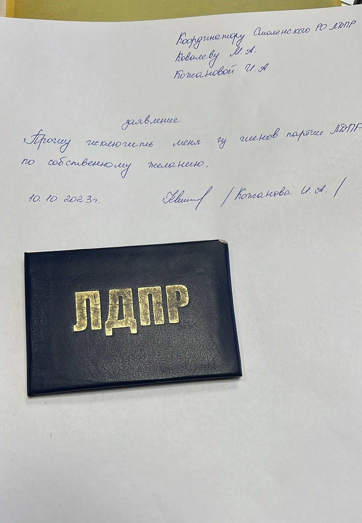 В четверг, 26 октября, Ирина Кожанова разместила в соцсети пост о том, что написала заявление, в котором просит исключить ее из членов партии ЛДПР по собственному желанию. В подтверждение своих слов она разместила фотографию за подписью: