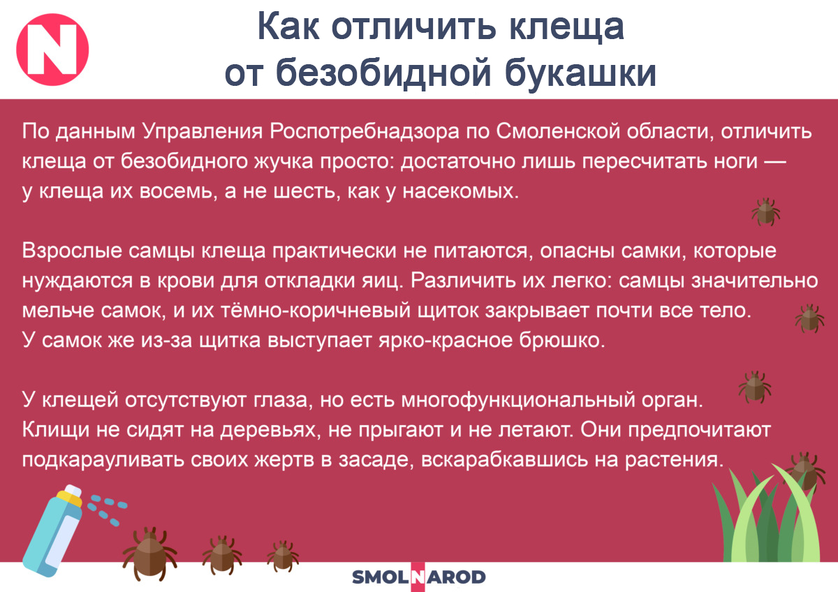 Опасность присасываний состоит в том, что клещи нередко являются переносчиками опасных инфекций. Как сообщает пресс-служба регионального управления Роспотребнадзора, в этом году специалисты лаборатории Центра гигиены и эпидемиологии в Смоленской области исследовали 25 паразитов, которые ранее были сняты с людей. В шести случаях выявлен возбудитель иксодового клещевого боррелиоза.