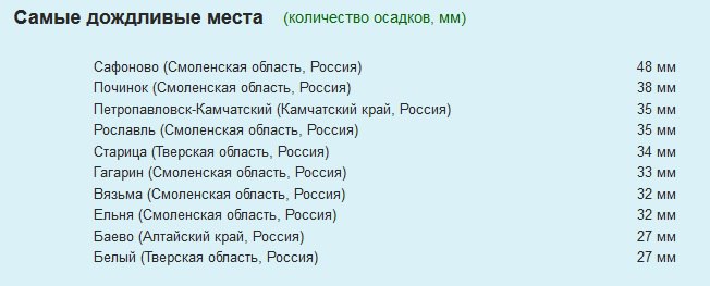 По словам столичного эксперта, в первой десятке списка самых дождливых мест России за 12 октября — шесть смоленских позиций, в том числе первые две заняли населенные пункты Смоленщины. Больше всего осадков выпало в Сафонове — 48 миллиметров, что составляет 80% от месячной нормы октября. На втором месте — Починок с 38 миллиметрами, на четвертом — Рославль (35 миллиметров), на шестом — Гагарин (33 миллиметра), на седьмом и восьмом — Вязьма и Ельня (по 32 миллиметра).