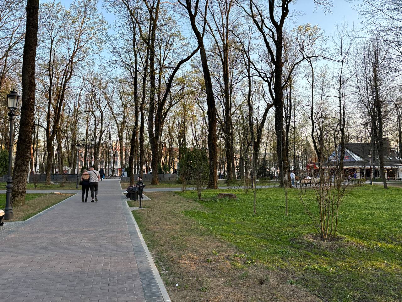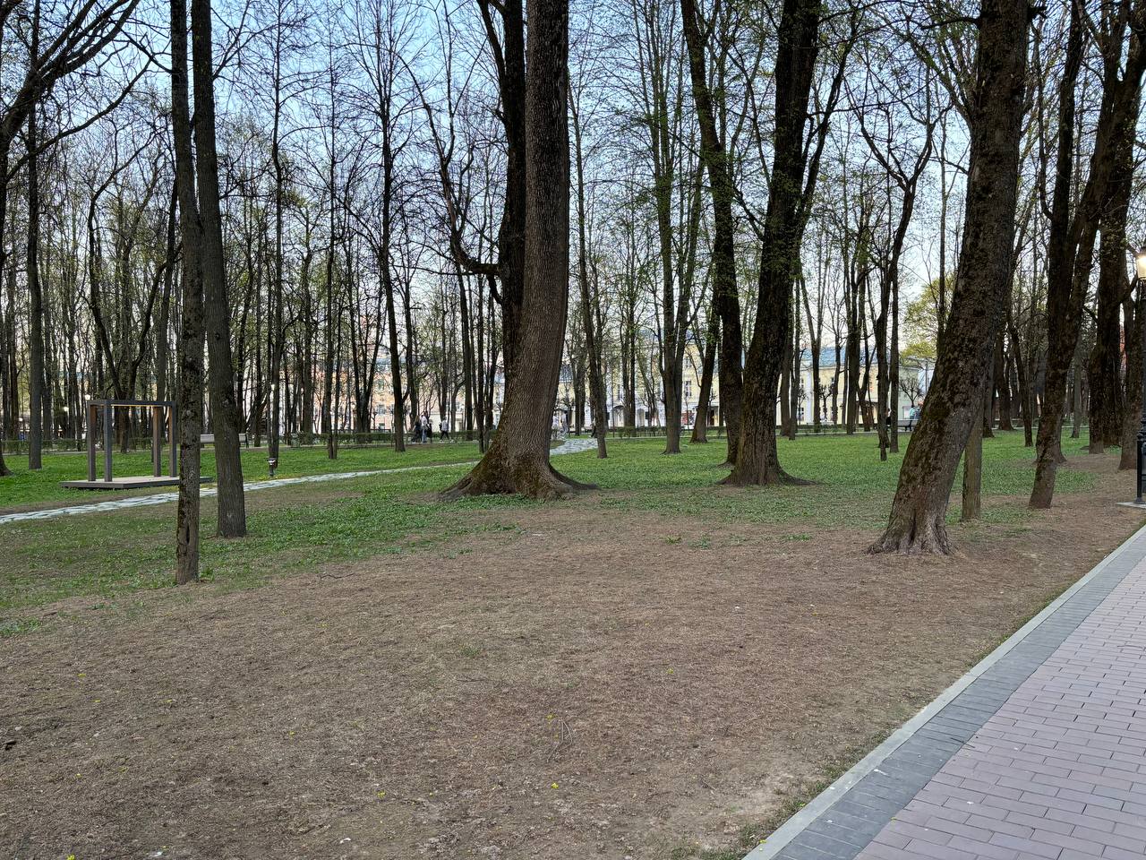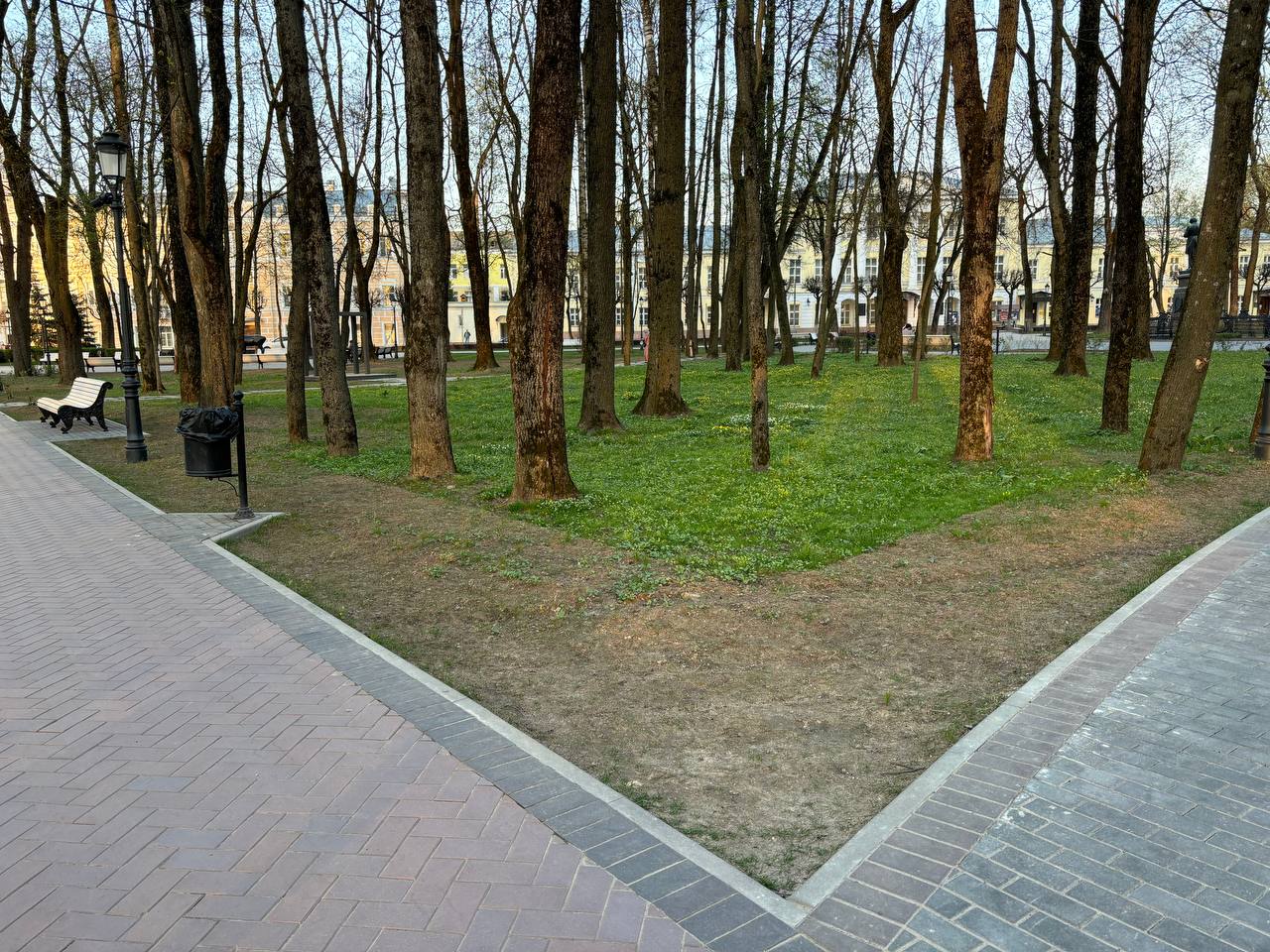 Тем временем в городском саду «Блонье» картина куда более замысловатая: где-то голая почва, где-то остатки рулонного газона, которые засохли еще прошлым летом. Местами зеленая зона действительно зеленая, но на контрасте с пустынными участками именно лоскутки с живой растительностью выглядят диковато.