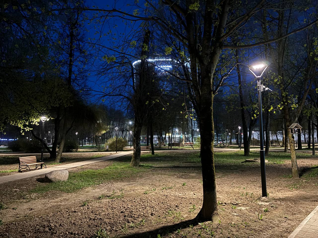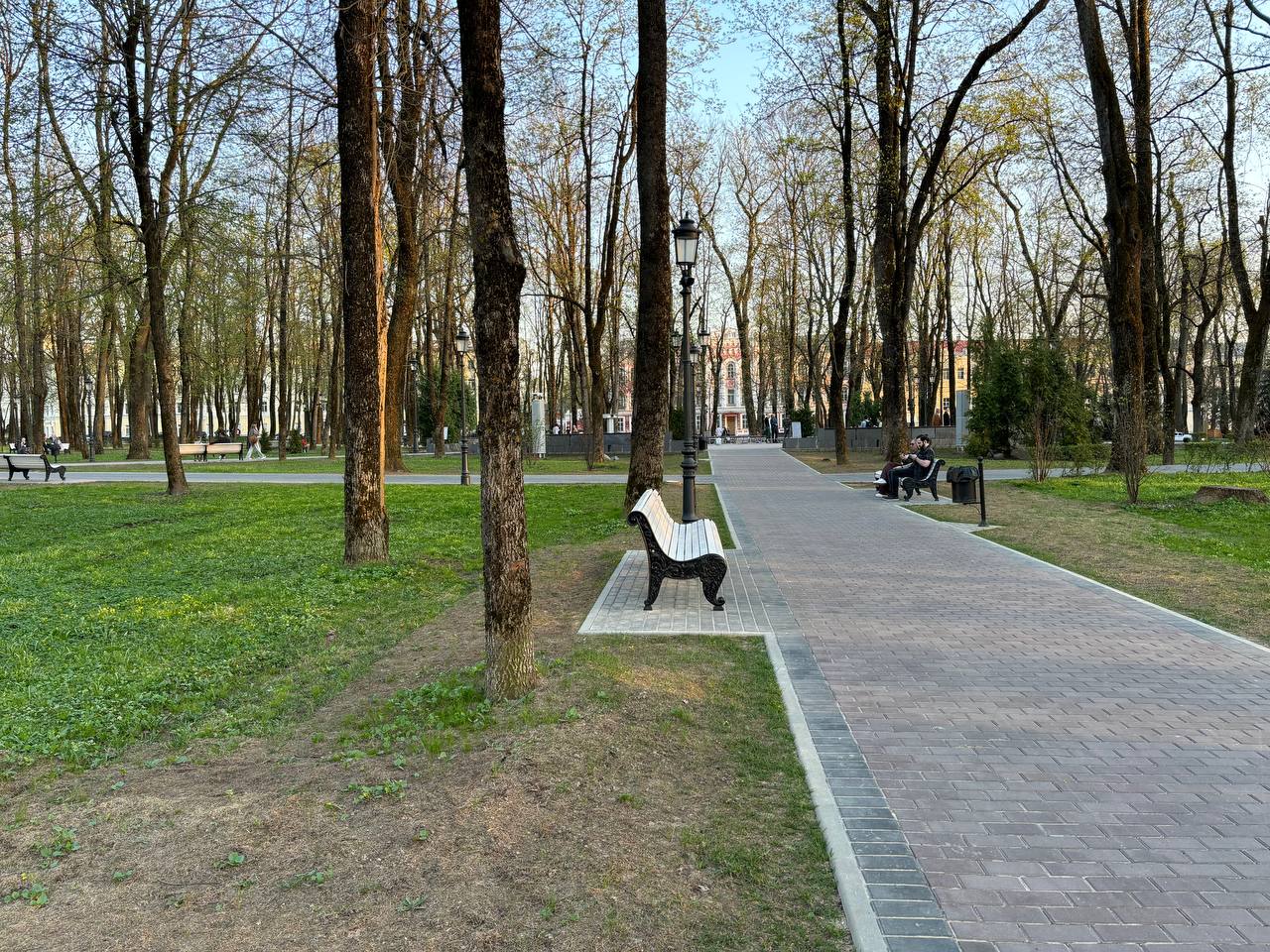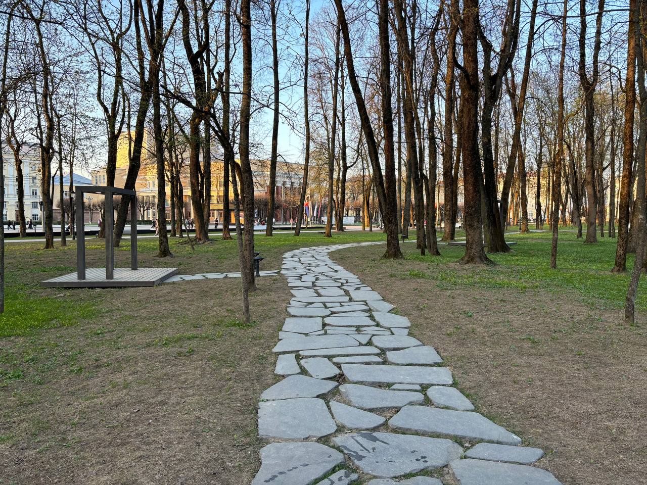 Тем временем в городском саду «Блонье» картина куда более замысловатая: где-то голая почва, где-то остатки рулонного газона, которые засохли еще прошлым летом. Местами зеленая зона действительно зеленая, но на контрасте с пустынными участками именно лоскутки с живой растительностью выглядят диковато.