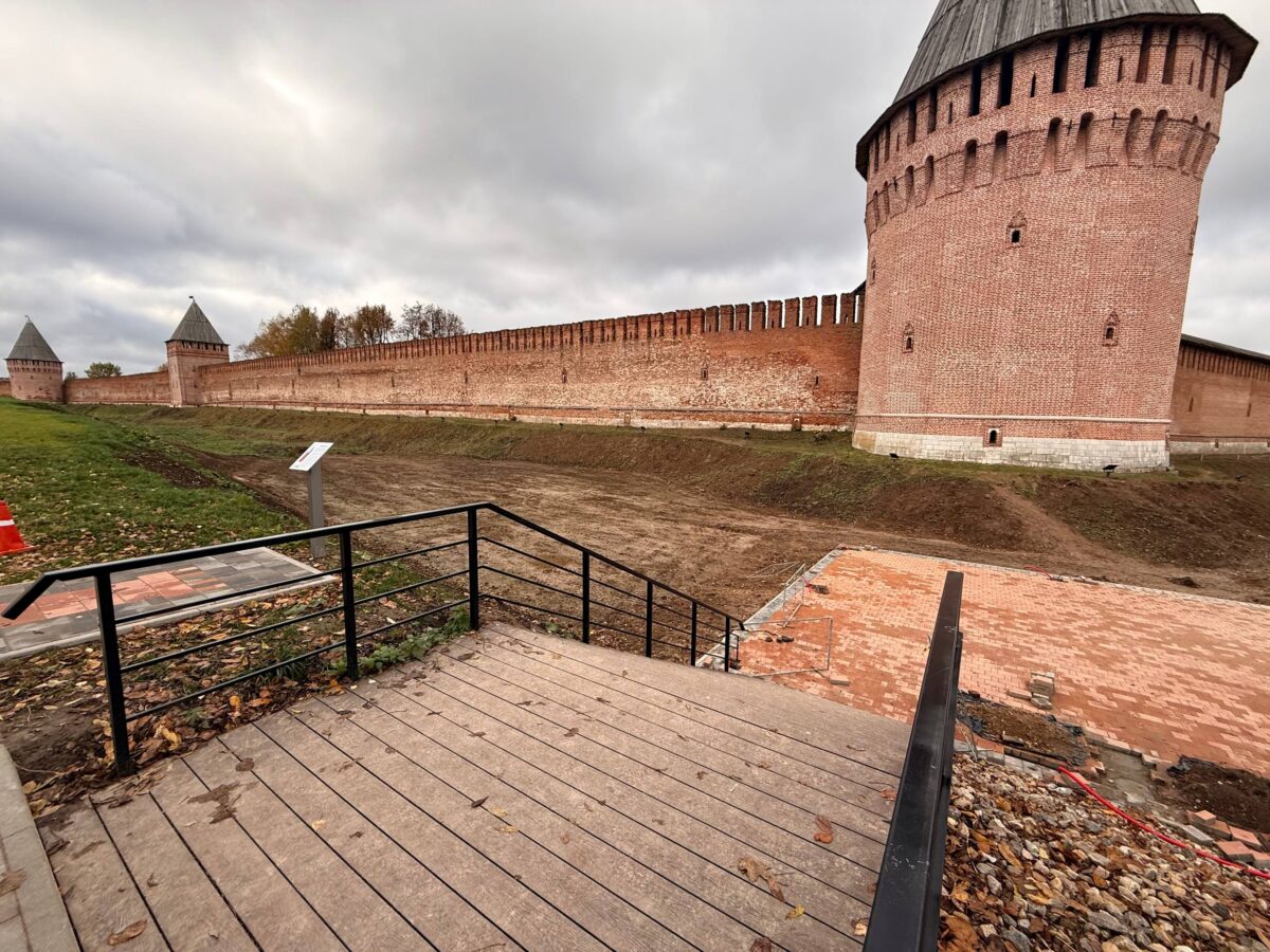 В настоящее время на объекте проводятся работы в рамках второго этапа благоустройства: подрядная организация обустраивает настил от Заалтарной башни до башни Орел для комфортных прогулок вдоль крепостной стены. Металлоконструкции уже установлены, облицовка древесно-полимерным композитом завершена. До конца месяца ожидается запуск в работу основного освещения и контурной подсветки, встроенной в поручни настила. Кроме того, в ближайшее время должна появиться архитектурно-художественная подсветка Заалтарной башни, Орла, Авраамиевских ворот и прясел стены.