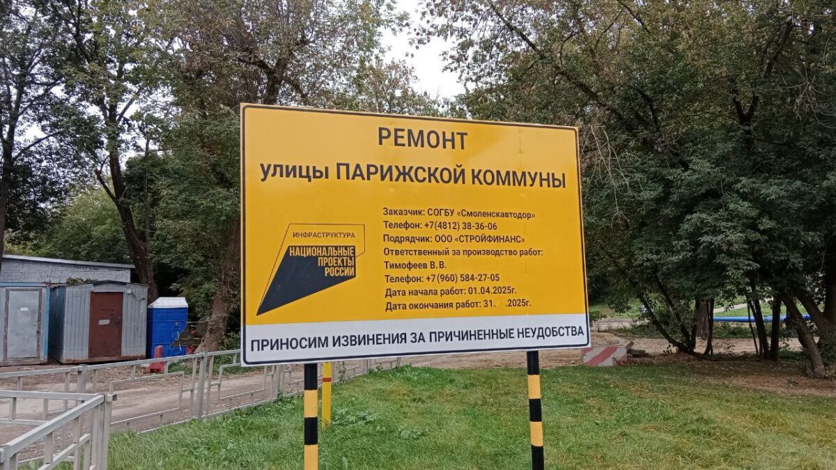 В Смоленске продолжается капитальный ремонт улицы Парижской Коммуны. Стоимость работ составляет 29,1 миллиона рублей. Контракт со смоленским ООО «СТРОЙФИНАНС» был заключен еще в августе 2024 года. При этом начать капремонт планировалось в апреле 2025 года, а завершить — в августе. Впрочем, лето уже закончилось, а работы все еще нет.