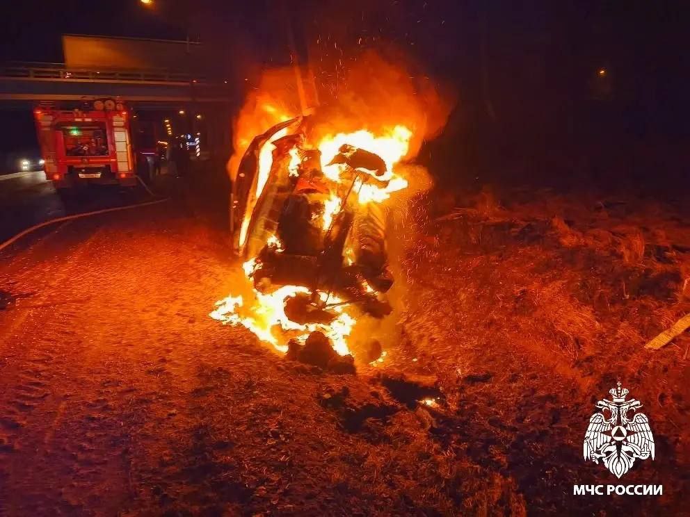 Авария произошла около 7:16 на дороге А-130 в районе деревни Большие Кириллы. Легковушка вылетела за пределы проезжей части, опрокинулась и, врезавшись в столб, загорелась.