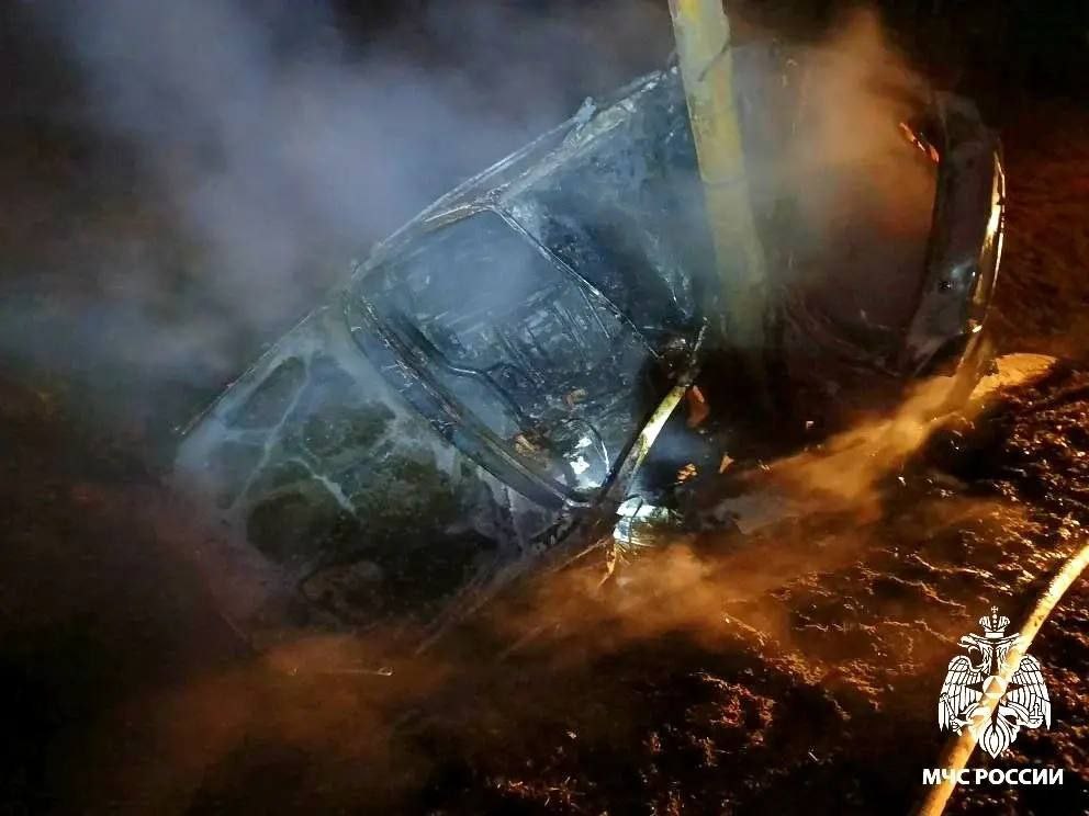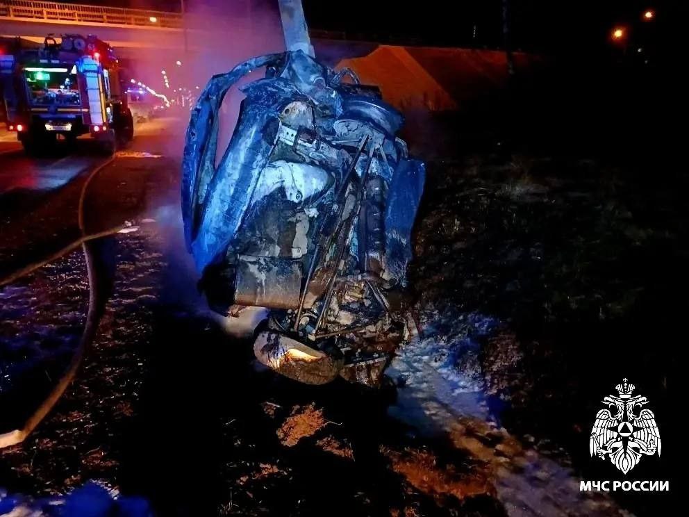 Очевидцы трагедии вызвали пожарных, на месте ДТП работали четыре сотрудника ведомства. В процессе ликвидации возгорания спасатели обнаружили в сгоревшем автомобиле тело водителя.
