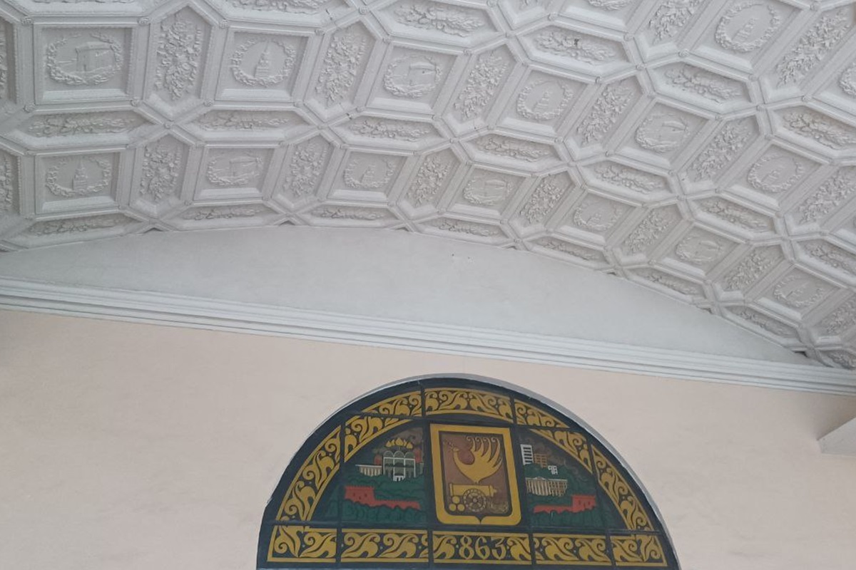 Сюда не могут просто так попасть все желающие, но в рамках проекта «Смоленск изнутри» – пожалуйста. В этом помещении когда-то размещался легендарный ресторан «Гудок». На потолке сохранилась необыкновенной красоты фреска с изображениями Спасской башни московского Кремля и одной из башен Смоленской крепостной стены.