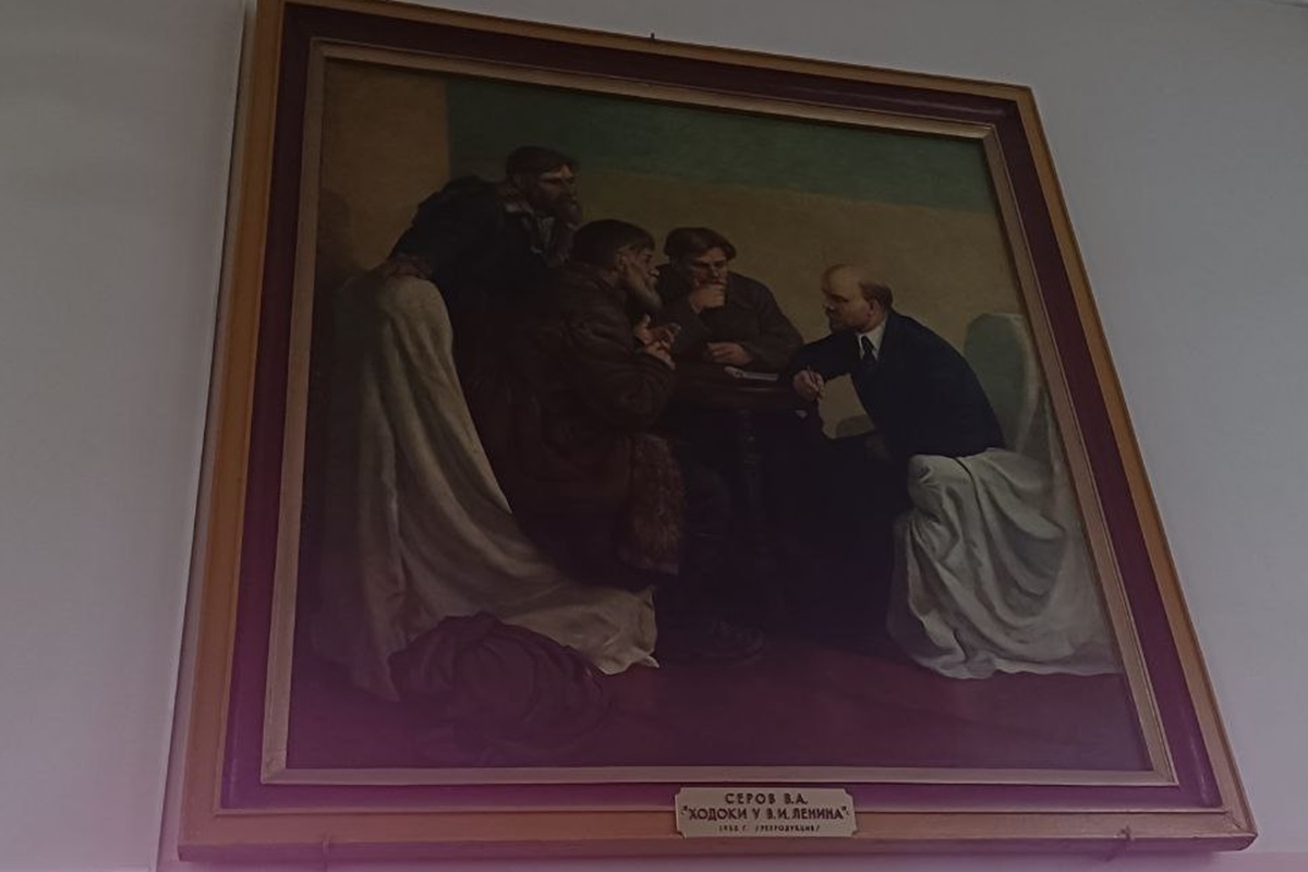 Далее она рассказала, что «Рубка леса» — одно из первых полотен, созданных во время поездки Ивана Шишкина на Валаам и показывающая величие русской природы. А картина «Ходоки у Ленина» Владимира Серова до сих пор вызывает много споров. На холсте художник уместил вождя и трех крестьян в полушубках за маленьким столом.