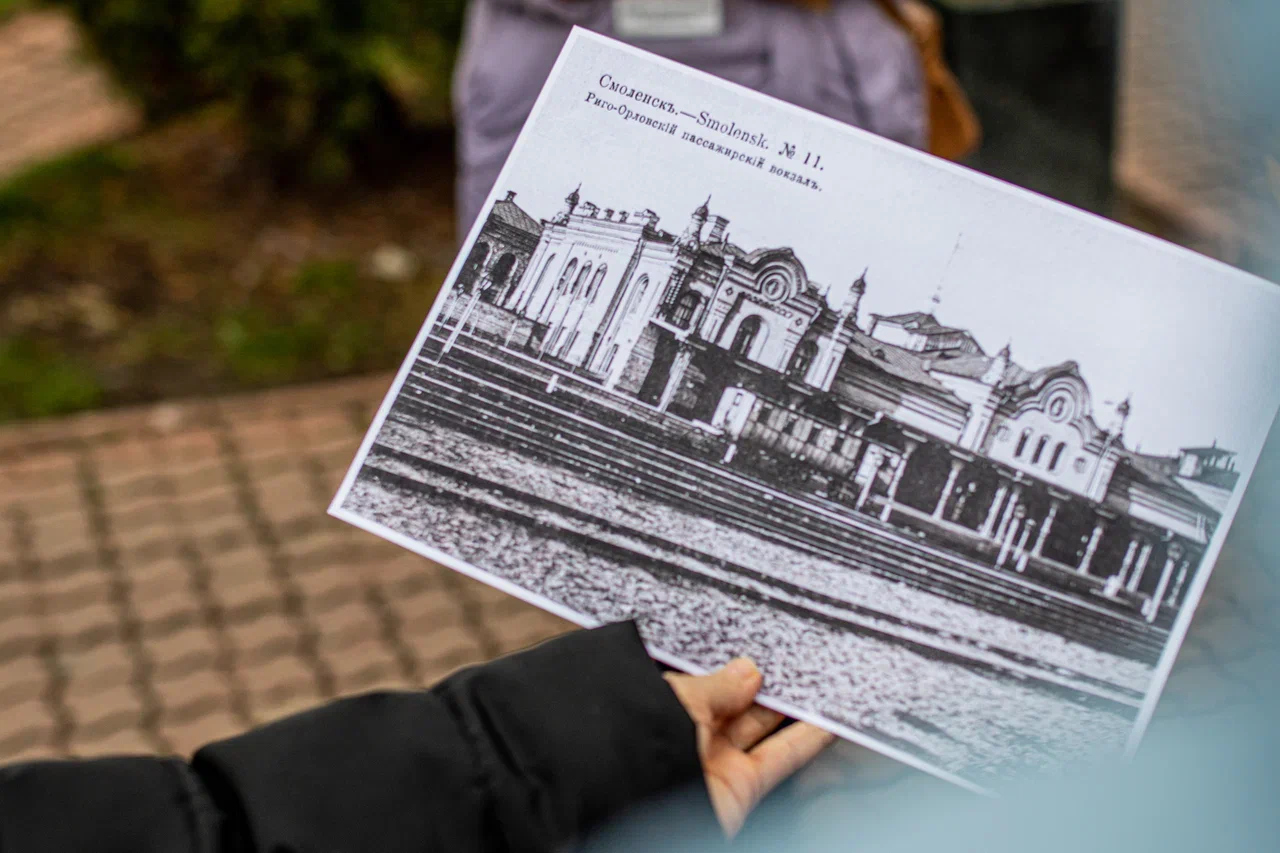 Встреча началась с рассказа экскурсовода об истории смоленской станции. До Великой Отечественной войны здесь было два здания, стоявших параллельно друг другу и соединенных аркой с часами. Во время военных действий вокзал разрушили, на его месте возвели деревянную постройку. Нынешний вокзал построен в 1949-1951 годах архитекторами Борисом Мезенцевым и Михаилом Шпотовым.