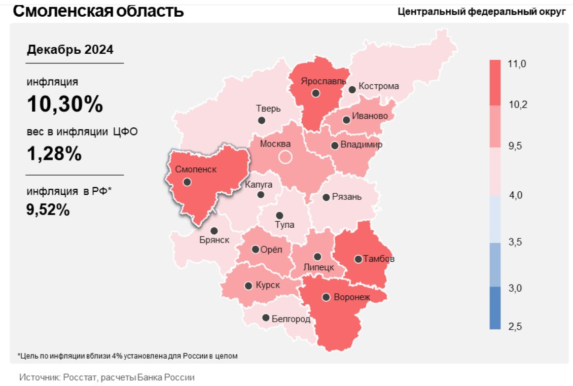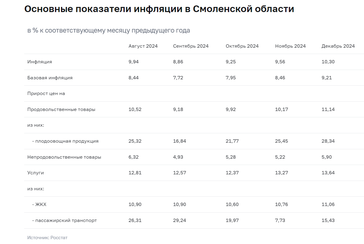 Годовая инфляция в Смоленской области в декабре 2024 года увеличилась до 10,30% после 9,56% в ноябре. В Центральном федеральном округе и по России в целом она также выросла, составив 9,92% и 9,52% соответственно.