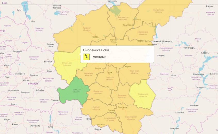 На прогностической карте предупреждений от Гидрометцентра РФ Смоленщина уже окрашена желтый цвет — это означает, что погодные условия могут представлять опасность для жизни и здоровья населения. Соседние же Калужская, Московская, Тверская и Псковская области и вовсе стали оранжевыми.