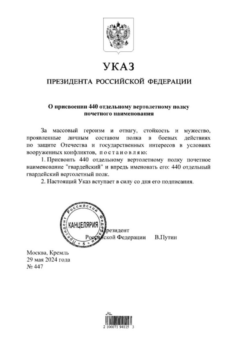 Президент России Владимир Путин присвоил 440 отдельному гвардейскому вертолетному полку, дислоцирующемуся в Вязьме Смоленской области, почетное наименование «гвардейский». Глава государства подписал соответсвующий указ 29 мая.