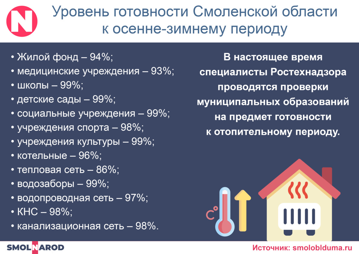 Сперва заместитель министра жилищно-коммунального хозяйства, энергетики и тарифной политики Смоленской области Руслан Шамсутдинов выступил с докладом об актуальном состоянии объектов коммунального хозяйства муниципальных образований. Как оказалось, школы, детские сады, социальные учреждения, учреждения культуры и водозаборы готовы к холодам на 99%. На 98% — учреждения спорта, канализационные насосные станции и канализационная сеть в целом. Водопроводная сеть подготовлена на 97%, котельные — на 96%. Несколько хуже обстоят дела с многоквартирными домами (94%), медицинскими учреждениями (93%) и тепловой сетью (86%). Но наибольшие вопросы вызывает имеющийся запас угля — только 73%.