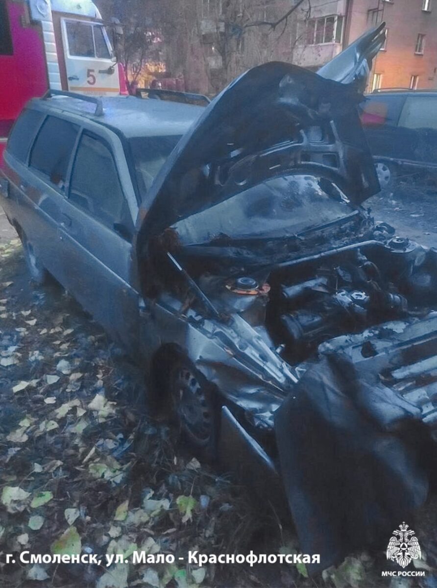 Второе возгорание произошло в Смоленске на улице Мало-Краснофлотской. Пожарных вызвали очевидцы, которые заметили дым, валивший из-под капота припаркованной легковушки. Подоспевшие спасатели оперативно ликвидировали возгорание, как итог — повреждено два квадратных метра подкапотного пространства.