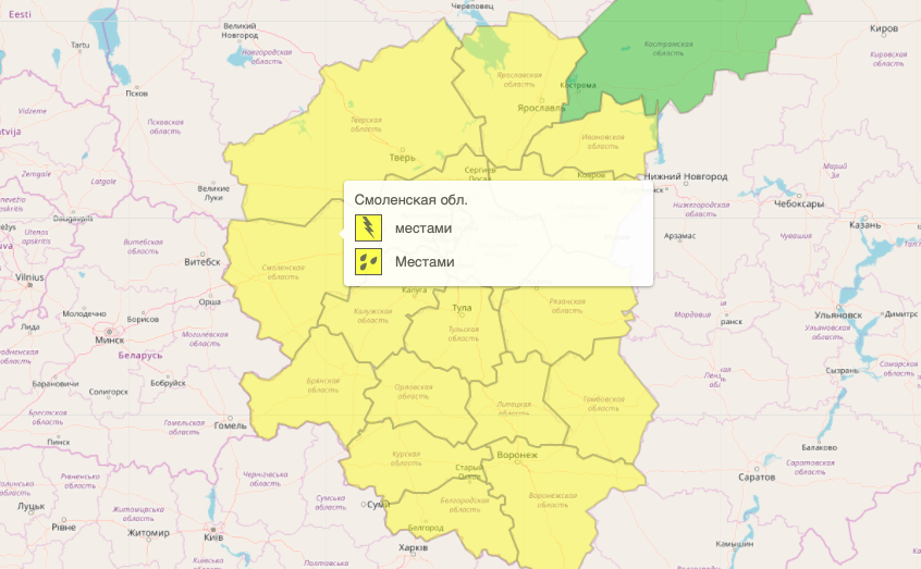 Одновременно Гидрометцентр России окрасил Смоленскую область в желтый цвет на прогностической карте. Это означает, что погодные условия в регионе расцениваются как потенциально опасные для населения.