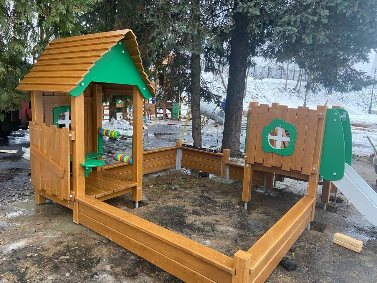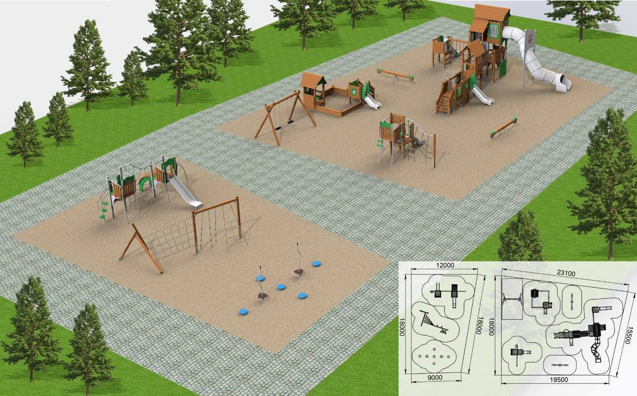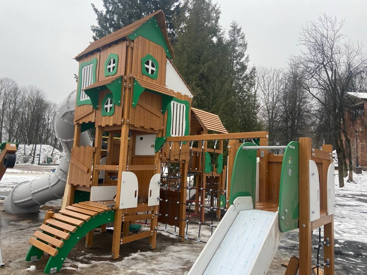 Детскую площадку размещают на месте прежней. Новые комплекс будет состоять из девяти элементов, каждый из которых выполнен из лиственницы.