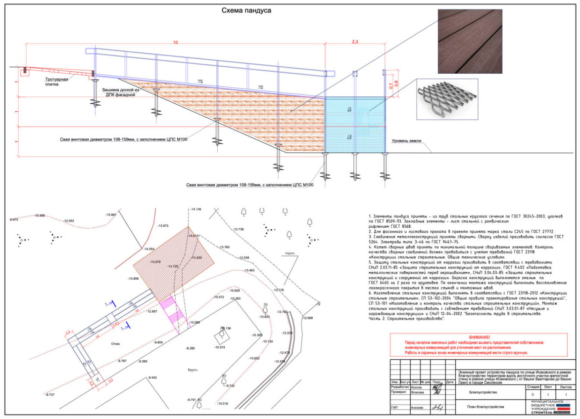 Подрядной организации предстоит обустроить пандус и пешеходные дорожки с покрытием из тротуарных бетонных плит. Все металлические поверхности должны быть покрыты молотковой краской графитового цвета в два слоя.