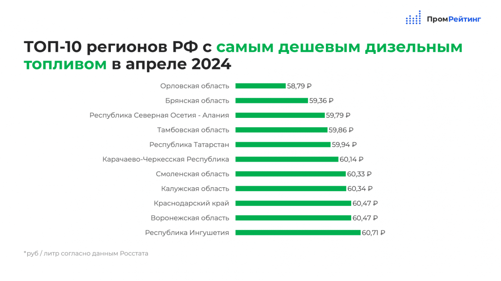 В десятку субъектов с бюджетным дизелем также попали Орловская и Брянская области, Северная Осетия, Тамбовская область, Татарстан, Карачаево-Черкесия, Калужская область, Краснодарский край, Воронежская область и Ингушетия.
