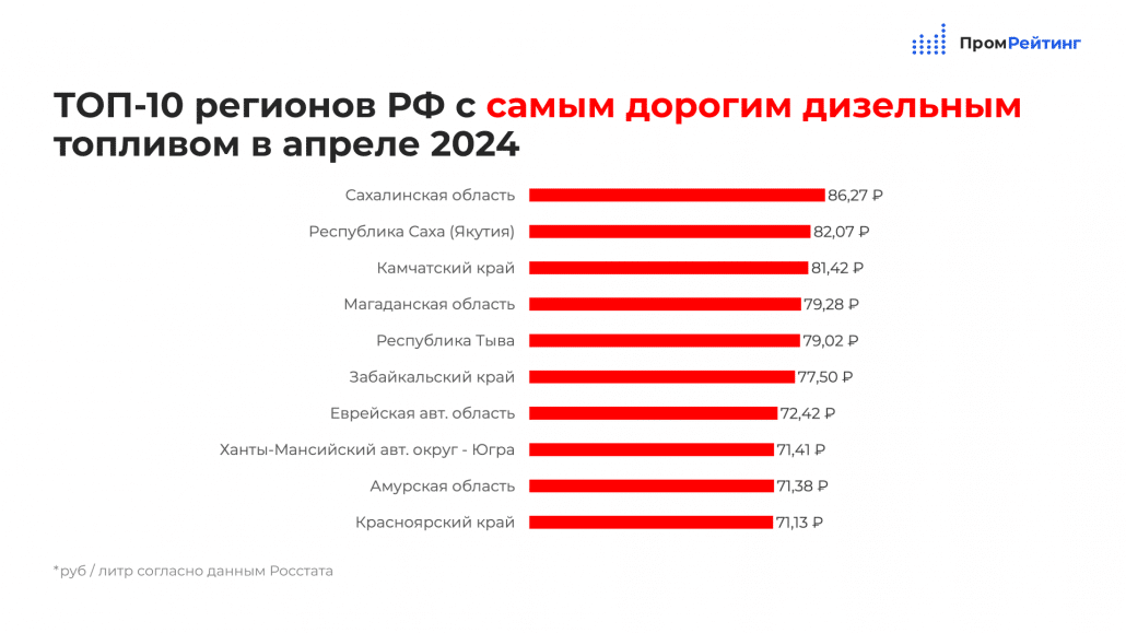 Наиболее дорогое дизельное топливо аналитики обнаружили в Сахалинской области, Якутии, Камчатском крае, Магаданской области, Тыве, Забайкальском крае, Еврейской автономной области, Ханты-Мансийском автономном округе, Амурской области и Красноярском крае.