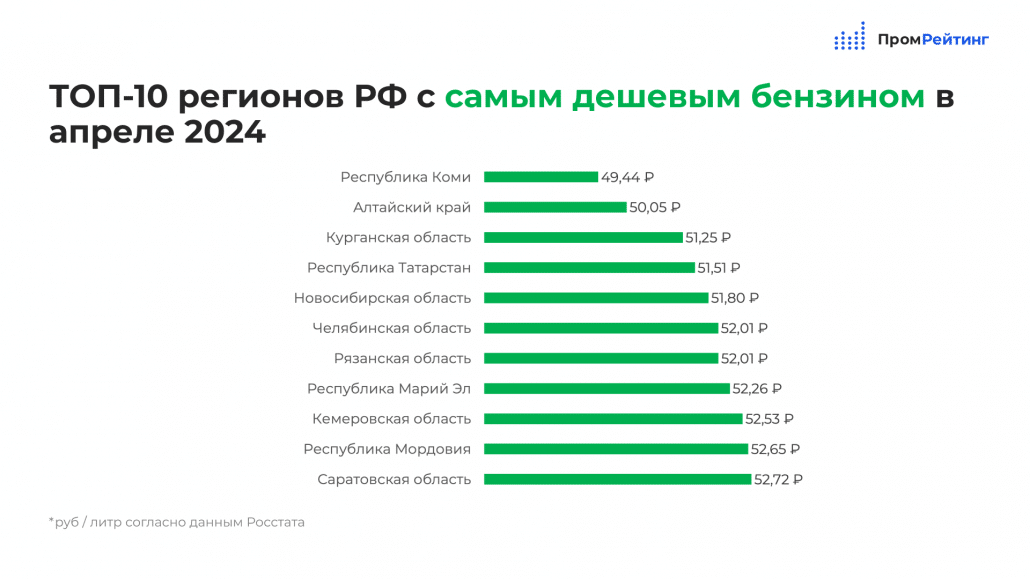 Тем временем индекс потребительских цен на бензин относительно марта вырос на 0,5%. Снижение зафиксировано лишь в шести регионах страны, наибольшее — в Чечне (-2,1%).