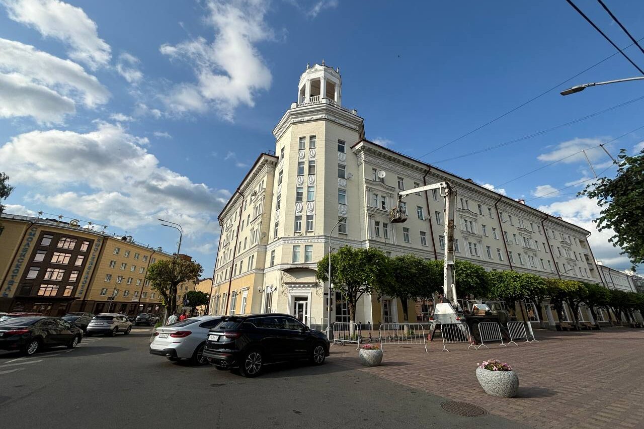 Речь идет о доме с восьмигранной одноэтажной башенкой-беседкой на крыше на пересечении улиц Ленина и Коненкова, которое в последние недели рабочие старательно украшают подсветкой. Здание было построено в середине 1950-х годов, сейчас является памятником регионального значения и подлежит государственной охране. Надпись на табличке, сообщающей смолянам и гостям города о статусе дома, гласит: «Лица, причинившие вред объекту культурного наследия, несут в соответствии с законодательством Российской Федерации уголовную, административную и иную ответственность». Но на деле всё несколько иначе.