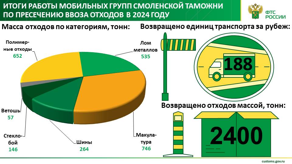 В 2024 году Смоленская таможня предотвратила масштабную попытку ввоза в Россию 2,4 тысячи тонн отходов. Благодаря оперативной работе мобильных групп, удалось остановить и вернуть в страну отправления 188 транспортных средств, груженных запрещенными к ввозу материалами.