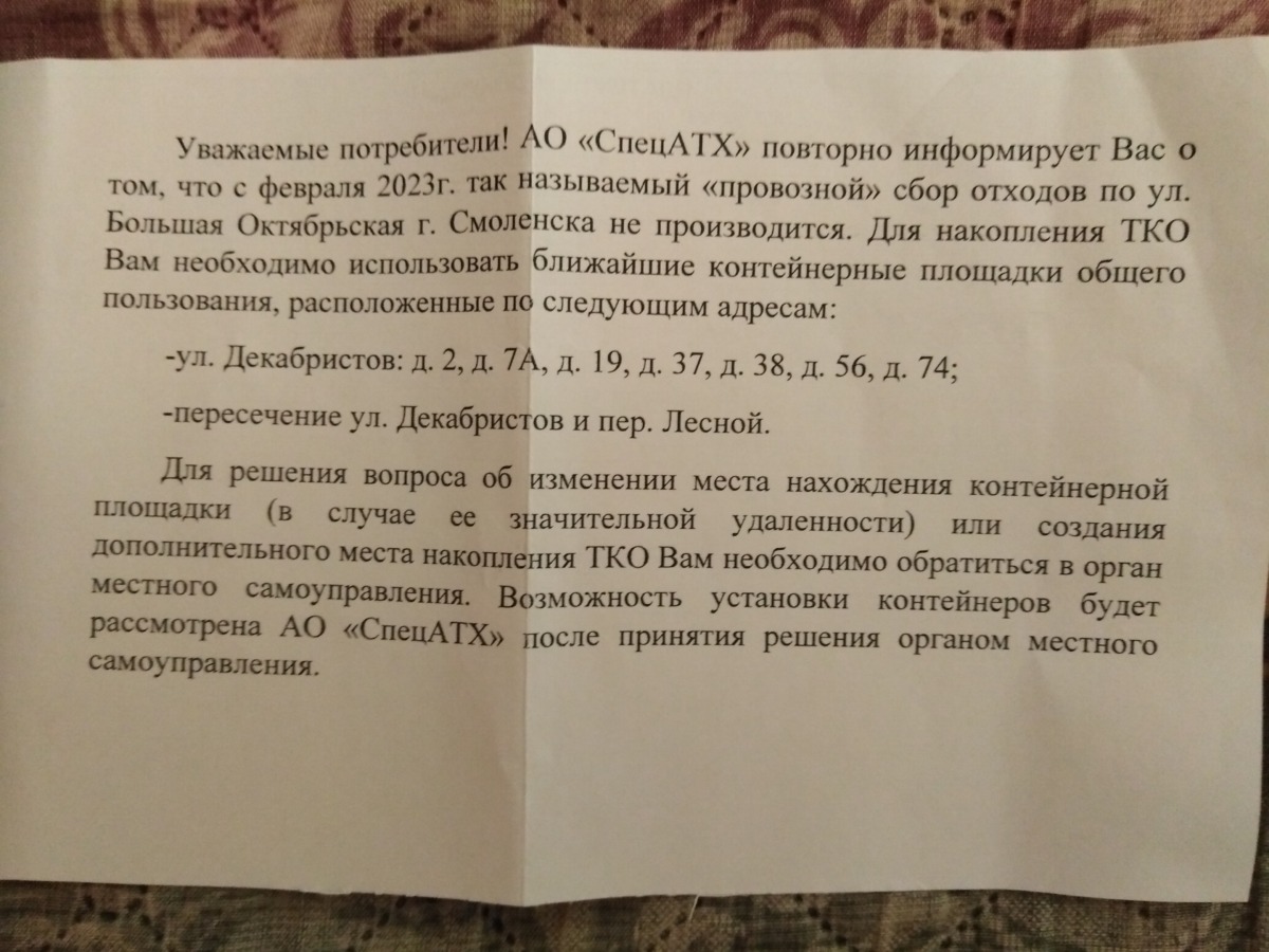— Да и сказали не всем! Многие оповестили через квитанции по окончании месяца, что теперь надо самим выносить мусор на Декабристов. А для тех, кто живут в конце улицы, это три километра пути в одну сторону, в обе — все шесть!