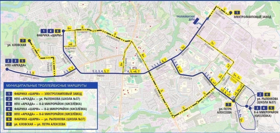 Добавим, что один из троллейбусных маршрутов начнет курсировать до Электролапового завода. Маршрут №5 заменит автобус под №20н («Аркада» — микрорайон Киселевка), №6 – №44н (микрорайон Киселевка — фабрика «Шарм»). Маршрут №7 станет дублером №45н (улица Кловская — улица Петра Алексеева).