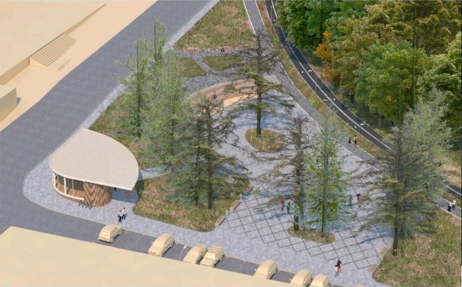 В число архитектурных объектов общественного пространства вошли павильон, танцевальная площадка с амфитеатром и открытым кинотеатром и арт-объект «Арка». Треугольный павильон будет разделен на две части: помещение проката и общественный туалет. Площадку планируется выполнить на металлическом каркасе с настилом. На ней будет находиться амфитеатр на три ступени с сидениями. Участок для размещения оператора с проектором расположится на верхней ступени. Арку предполагается изготовить из металлического каркаса с обшивкой композитным материалом светлого цвета.