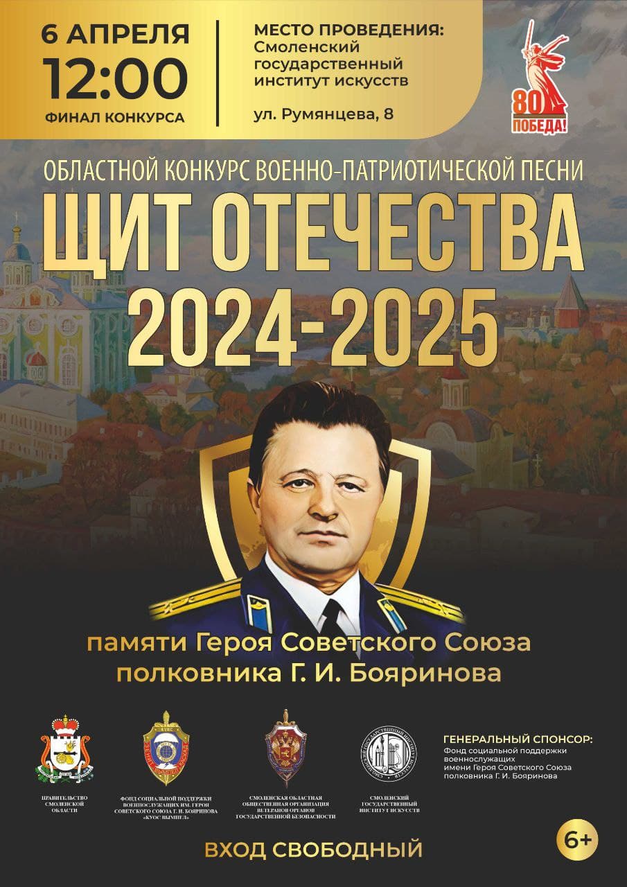 В воскресенье, 6 апреля, на базе Смоленского государственного института искусств (улица Румянцева, 8) пройдет конкурс военно-патриотической песни «Щит Отечества». Мероприятие посвящено памяти Героя Советского Союза, Почетного гражданина Смоленской области, уроженца Ершичского района Григория Бояринова.