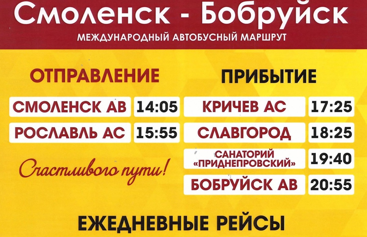 Смоленский автовокзал готовится порадовать пассажиров новым международным маршрутом. Уже скоро автобусы начнут курсировать по направлению Смоленск – Бобруйск. По пути предусмотрены остановки в Кричеве, Славгороде и у санатория «Приднепровский», что позволит пассажирам комфортно планировать свои поездки.
