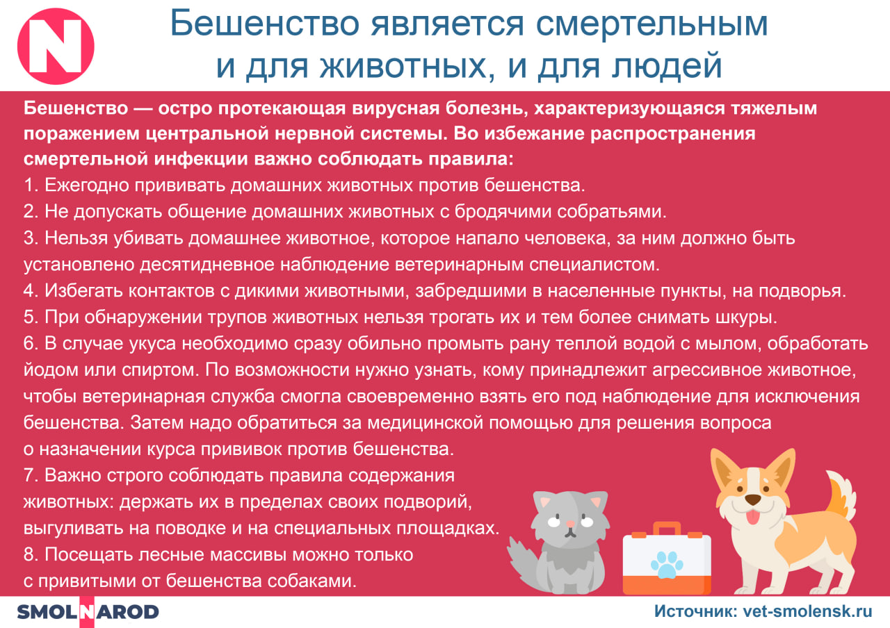С начала 2025 года в Смоленской области зафиксировано 20 случаев бешенства. Зараженные животные были обнаружены в восьми муниципальных округах: Гагаринском, Кардымовском, Монастырщинском, Новодугинском, Починковском, Руднянском, Смоленском и Хиславичском.