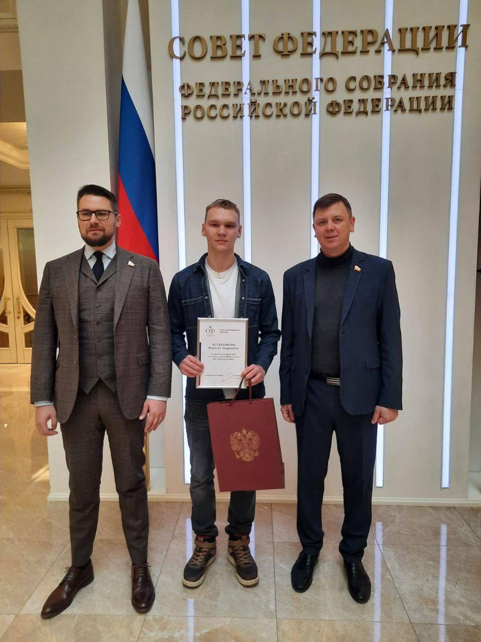 В Совете Федерации состоялась торжественная встреча с Кириллом Астапенковым – одним из трех подростков из Краснинского района, которые летом прошлого года спасли женщину из озера в деревне Маньково.
