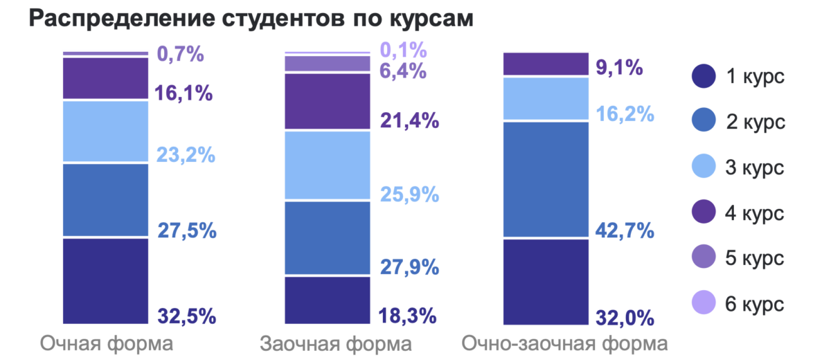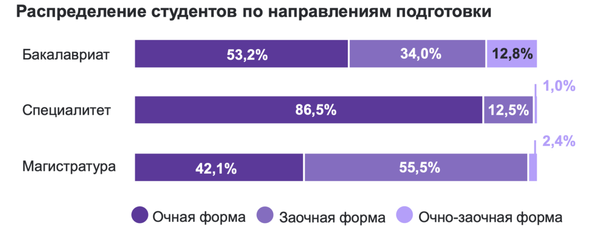 ТОП направлений подготовки высших учебных заведений по выпуску студентов выглядит следующим образом: «Физическая культура» и «Экономика» среди бакалавров, «Лечебное дело» и «Ветеринария» среди специалистов, «Экономика» и «Государственное и муниципальное управление» среди магистров.
