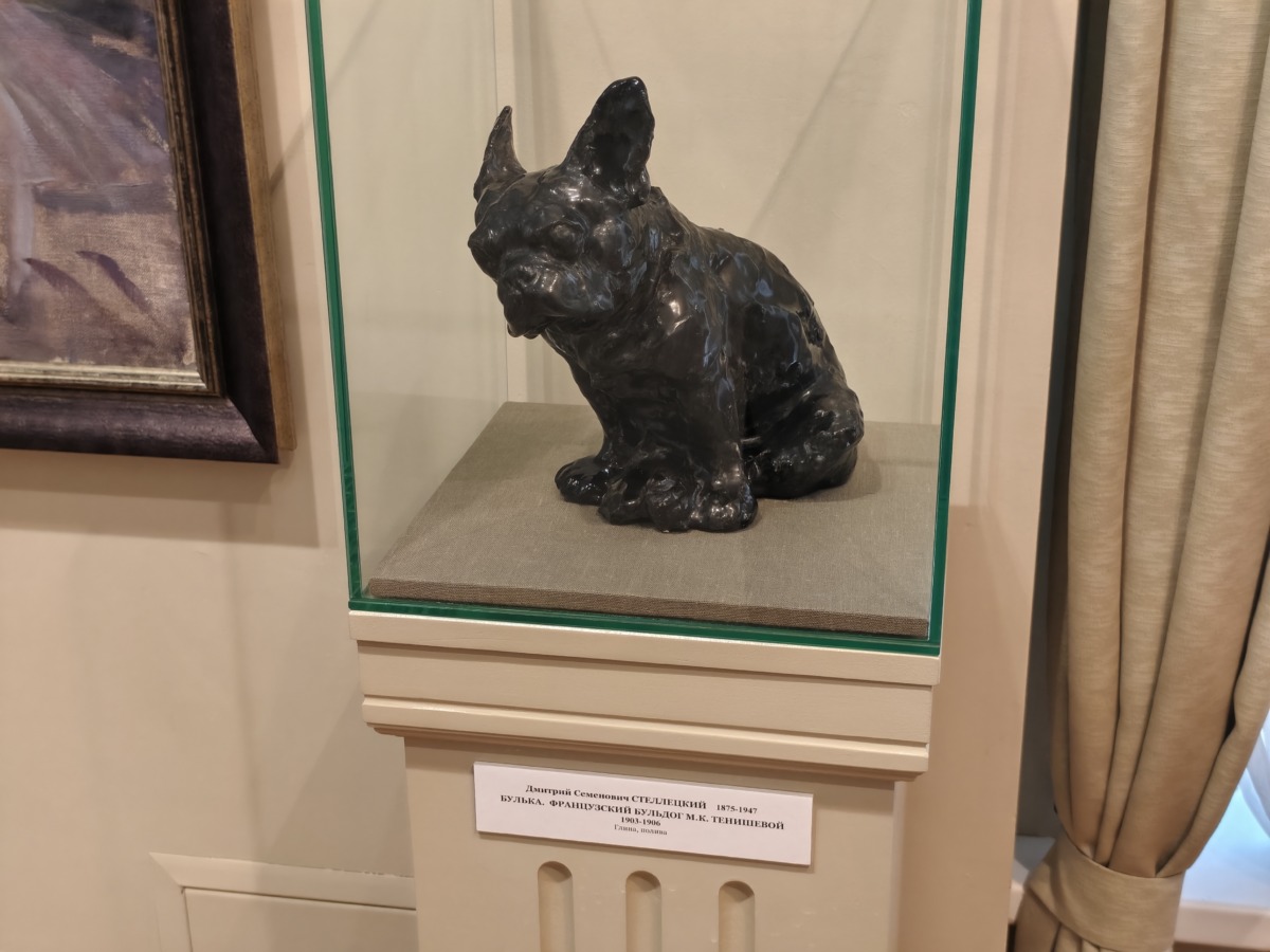 Интересно, что в зале русской живописи появился новый экспонат «Булька. Французский бульдог М.К. Тенишевой». Скульптуру выполнил художник Дмитрий Стеллецкий, частый гость имения княгини Тенишевой. Произведение датируется 1903–1906 годами и выполнено в технике поливной керамики.