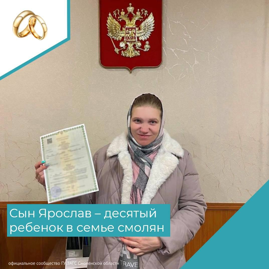В Главном управлении ЗАГС Смоленской области рассказали о многодетной семье. Жительница областного центра Злата Сергеевна стала мамой в десятый раз.