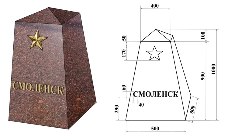 Техническое задание предполагает изготовление 19 обелисков из коричнево-бордового гранита со светлыми вкраплениями. Как и сейчас, 13 стел будут посвящены городам-героям. Еще два обелиска будут напоминать о городах воинской славы Смоленской области — Вязьме и Ельне. Названия остальных городов воинской славы планируется разместить группами на четырех оставшихся обелисках.
