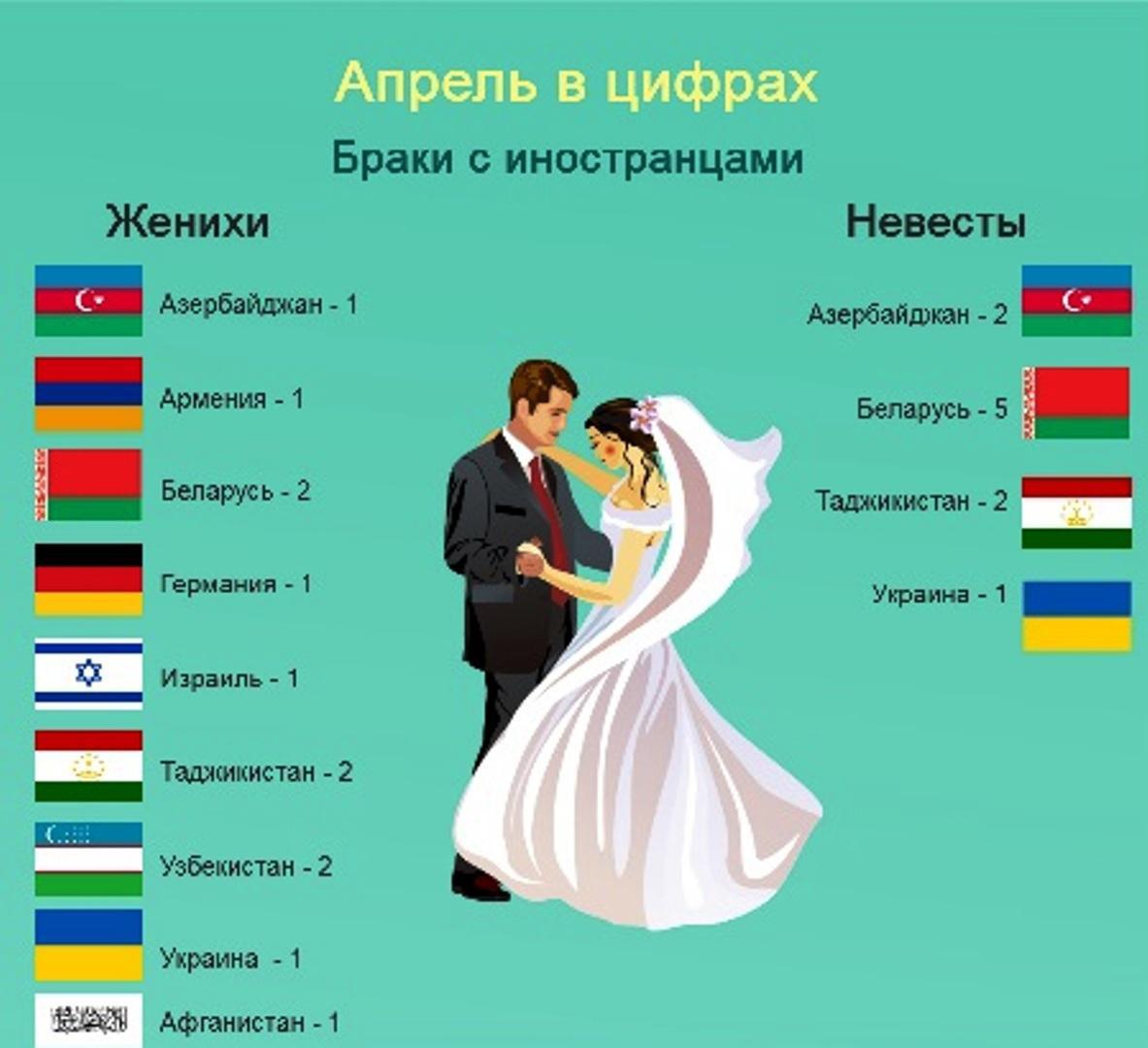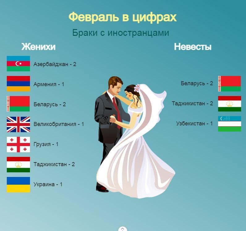 Сотрудники ЗАГС отмечают, что интернациональные браки в нашем регионе не редкость. Количество таких «росписей» постоянно растет. В феврале этого года среди женихов-иностранцев были граждане Азербайджана, Беларуси, Таджикистана (по два будущих мужа из каждой страны), а также по одному из Армении, Великобритании, Грузии, Украины.